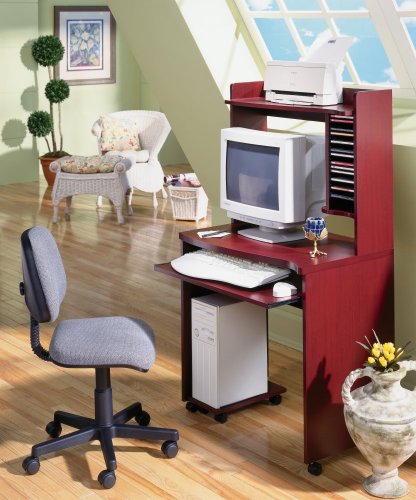 Compact and efficient, this mobile computer desk is attractive, yet takes up only a tiny amount of space. High quality casters allow the desk to be moved easily from place to place, and the smooth gliding retractable keyboard tray drawer and ergonomic shape afford maximum comfort to use. Available in mahogany or natural maple finish. Features: Compact design Media storage area CPU stand Top shelf can function as a printer shelf Casters for ease of movement Retractable keyboard tray with metal glides Easy to assemble